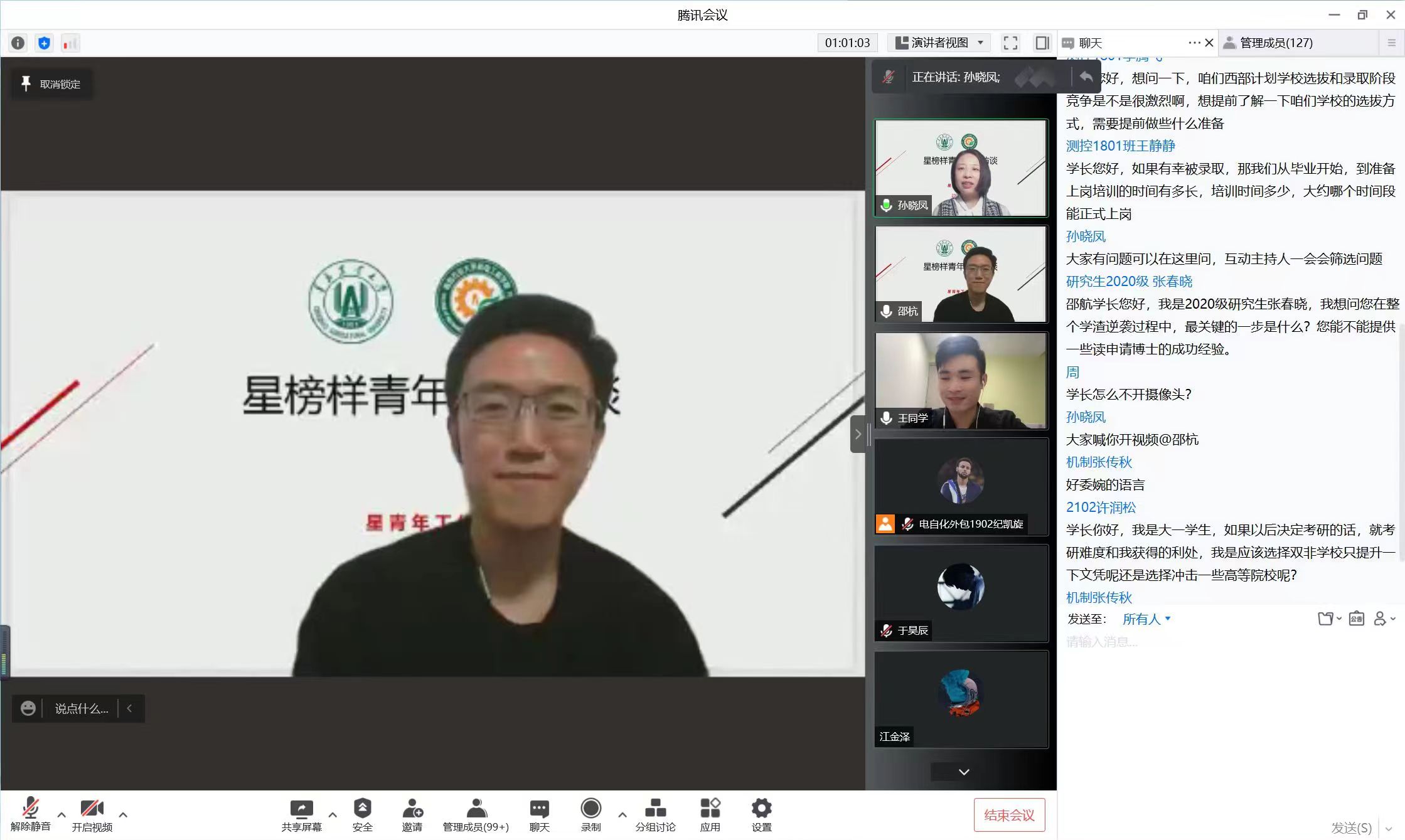 访谈活动连线了邵杭在校期间的好友,回忆分享了他们共同经历的老员工活。此外,还设置了互动环节,由2017级员工李先杰担任主持人,来自太阳成集团tyc234cc大一到大四的本科生代表、部分研究生还有员工总会的员工志愿者代表与邵杭在线上进行了互动交流。