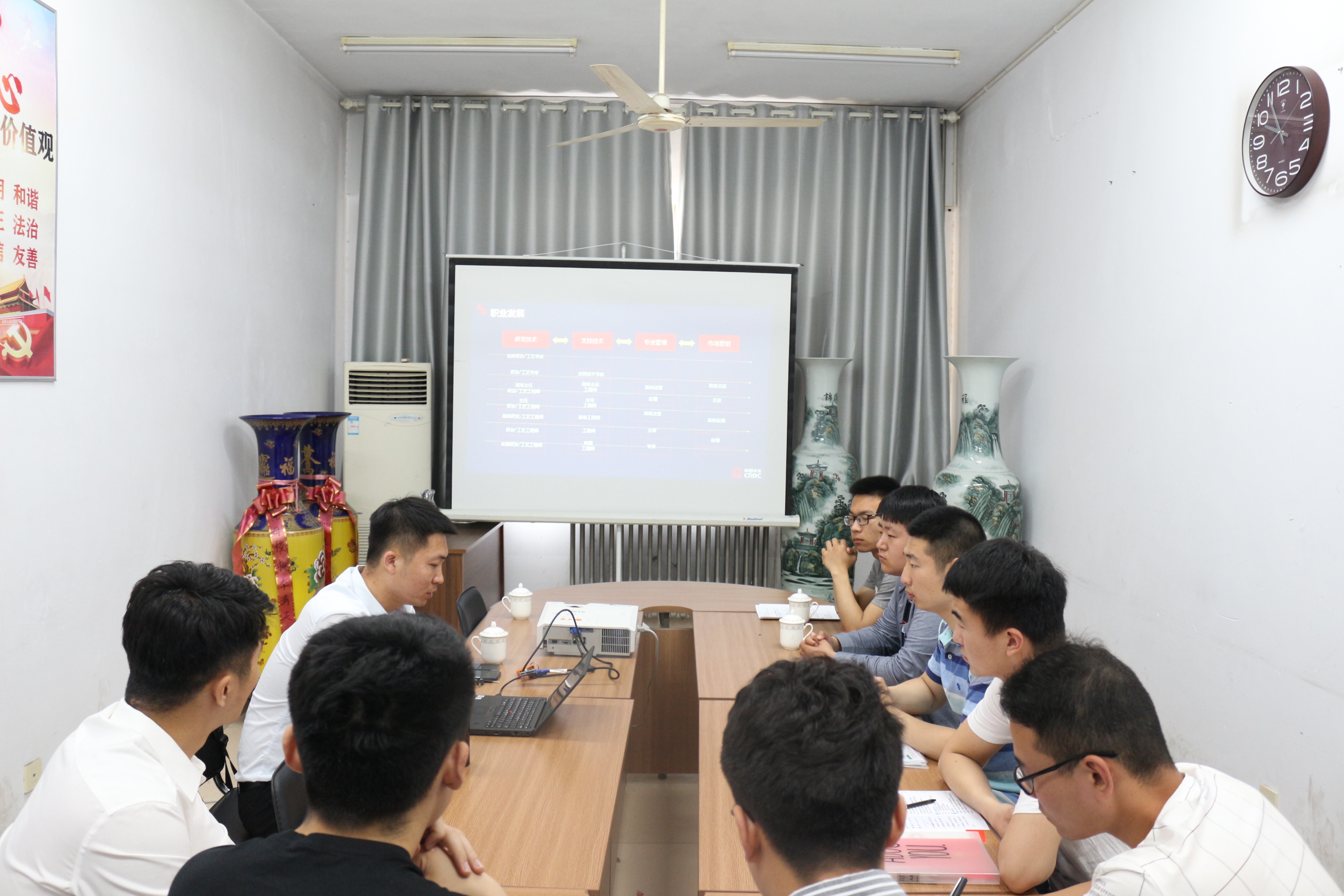 中车招聘负责人介绍了我国高端装备制造业的大体情况和中车青岛四方研究所公司的相关信息。公司本科人才占比25.8%,薪酬福利水平高于同岗位社会平均水平,负责人重点强调,公司在国资委进行管控下蓬勃发展,广纳有核心价值观念的年轻员工进行技术支持和科技研发。宣讲结束后,负责人对应聘同学进行了现场面试。