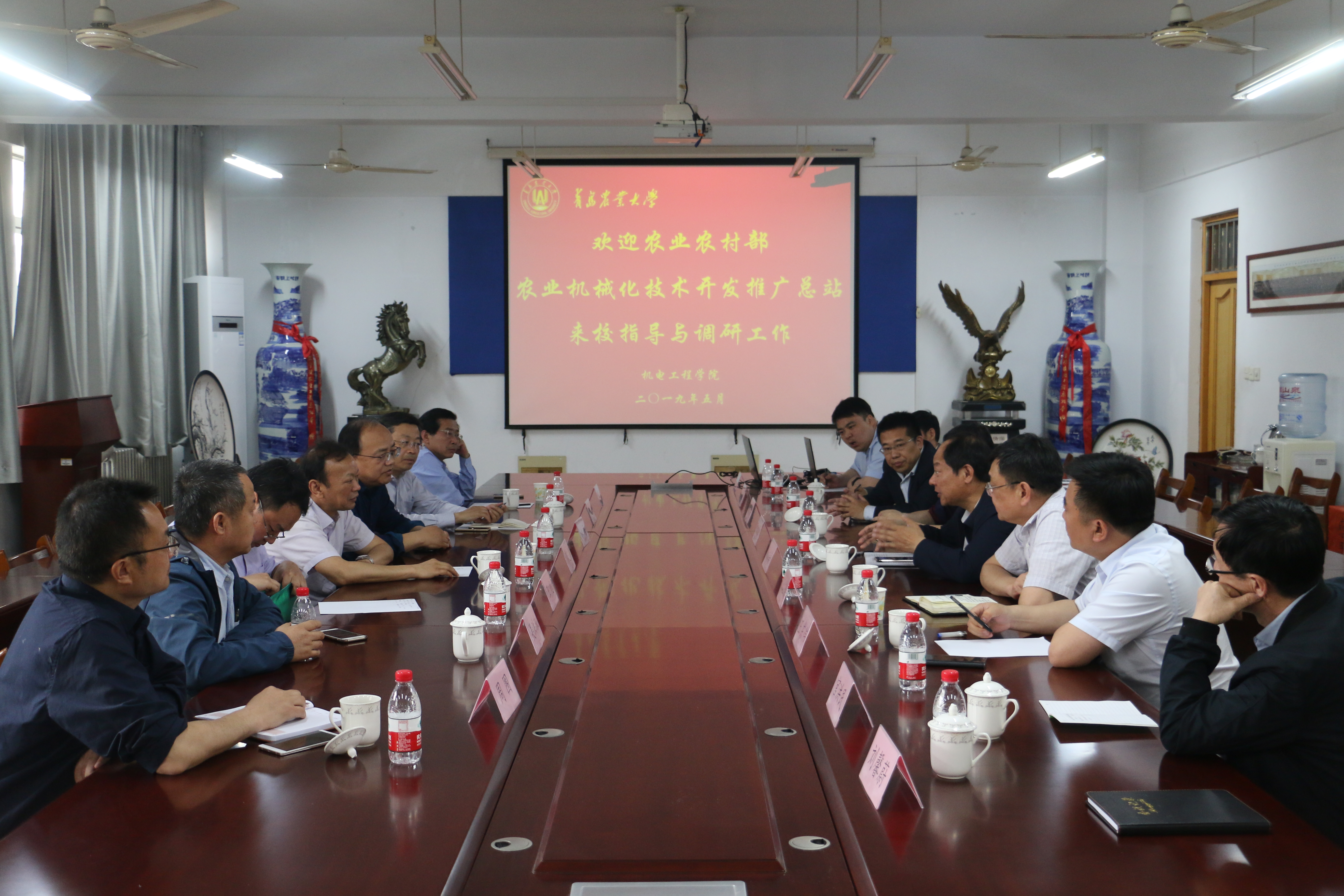 5月11日,农业农村部农机推广总站副站长涂志强、农机推广一处处长姚海、副处长王超、青岛市农业农村局副局级干部程兴谟、青岛市农机推广站站长周围、胶州市农机局局长阎凤强、青岛洪珠农业机械有限公司总经理吴洪珠来访太阳成集团tyc234cc,经理尚书旗、党委书记李在洪、部分教师代表参加了座谈交流。