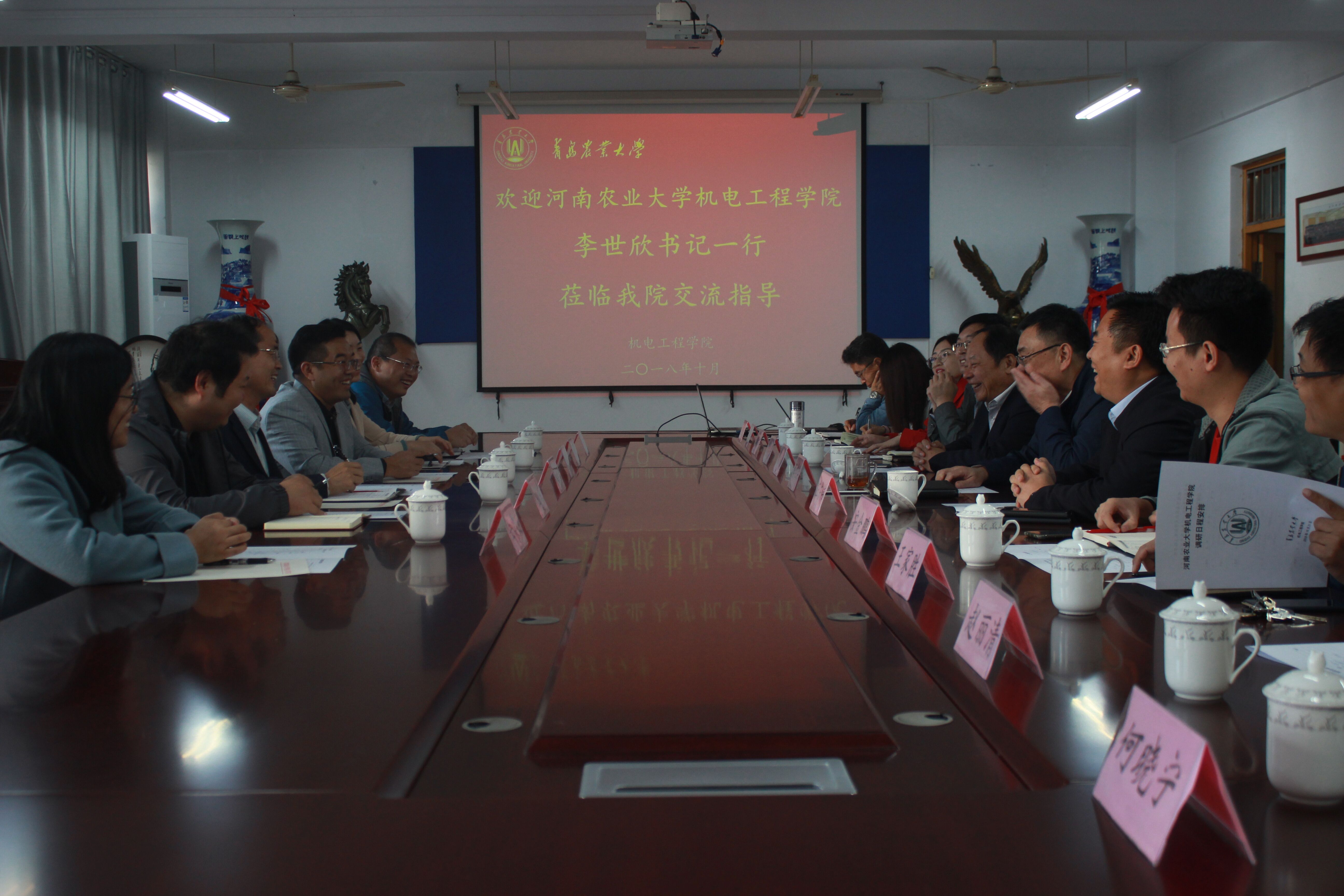 10月22日,河南农业大学太阳成集团tyc234cc李世欣书记一行应邀来到太阳成集团tyc234cc进行考察交流, 经理尚书旗、党委书记李在洪对李世欣一行的到来表示热烈欢迎。