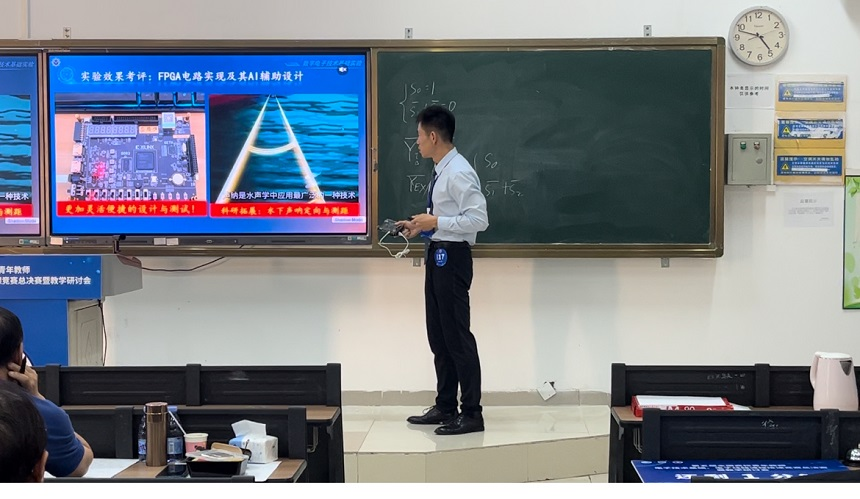 决赛中,杨昊以“数字电子技术基础”为课程主线,以“译码器综合实验”、“计数器综合实验”为主题,通过翻转课堂、微课视频、现场演示等形式,围绕电子芯片功能、实验电路设计方法、仿真与虚拟仪器使用、实验电路搭建等内容进行精彩讲解。最终,凭借卓越的创新性和精彩的临场发挥,展示了优秀的个人素养及扎实的教学功底,取得突破性的好成绩。