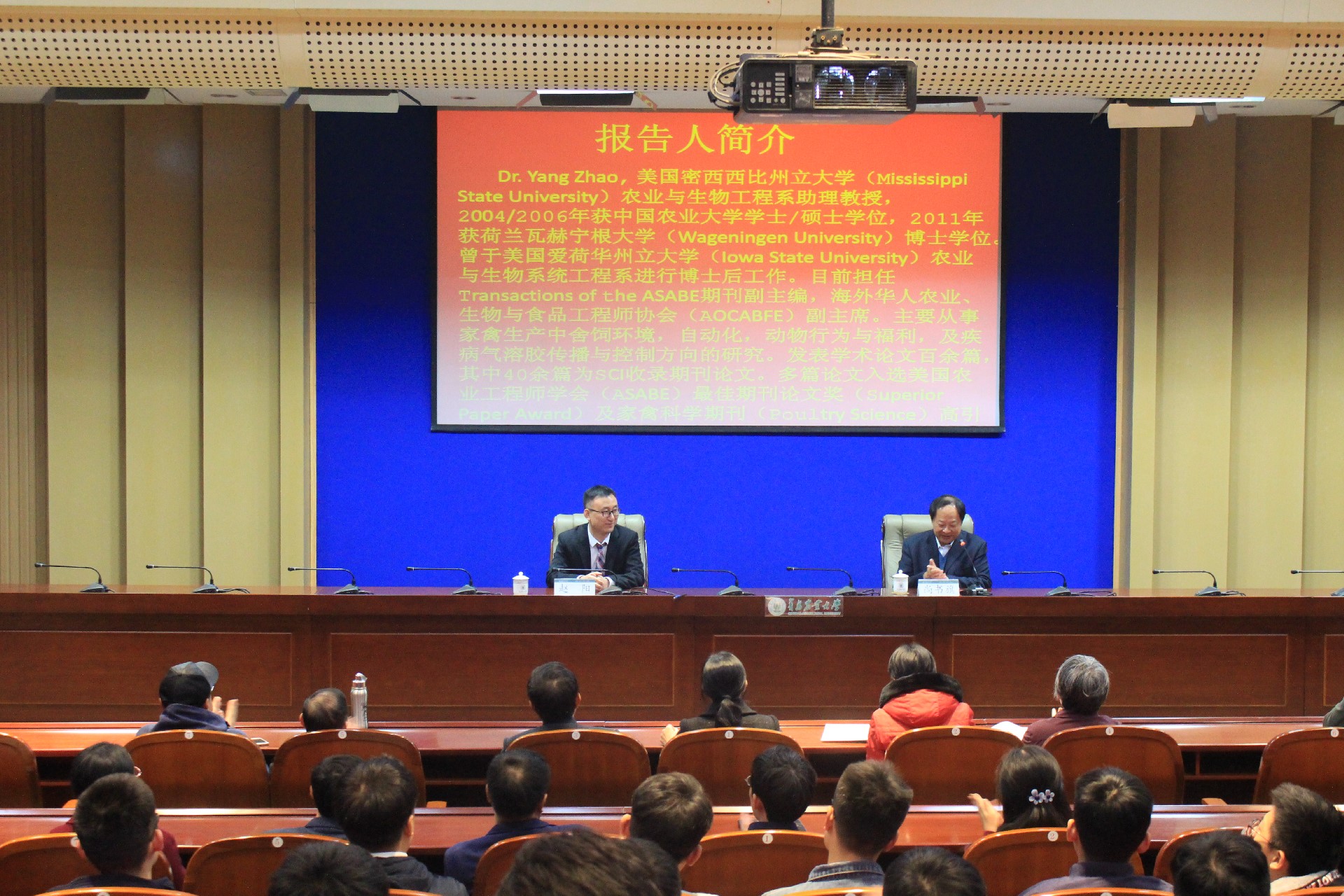 11月13日,美国密西西比州立大学农业与生物工程系助理教授赵阳博士为公司师生作了题为“精准农业在家禽生产中的应用”的学术报告。太阳成集团tyc234cc经理尚书旗教授主持,全校近300名师生参加。
