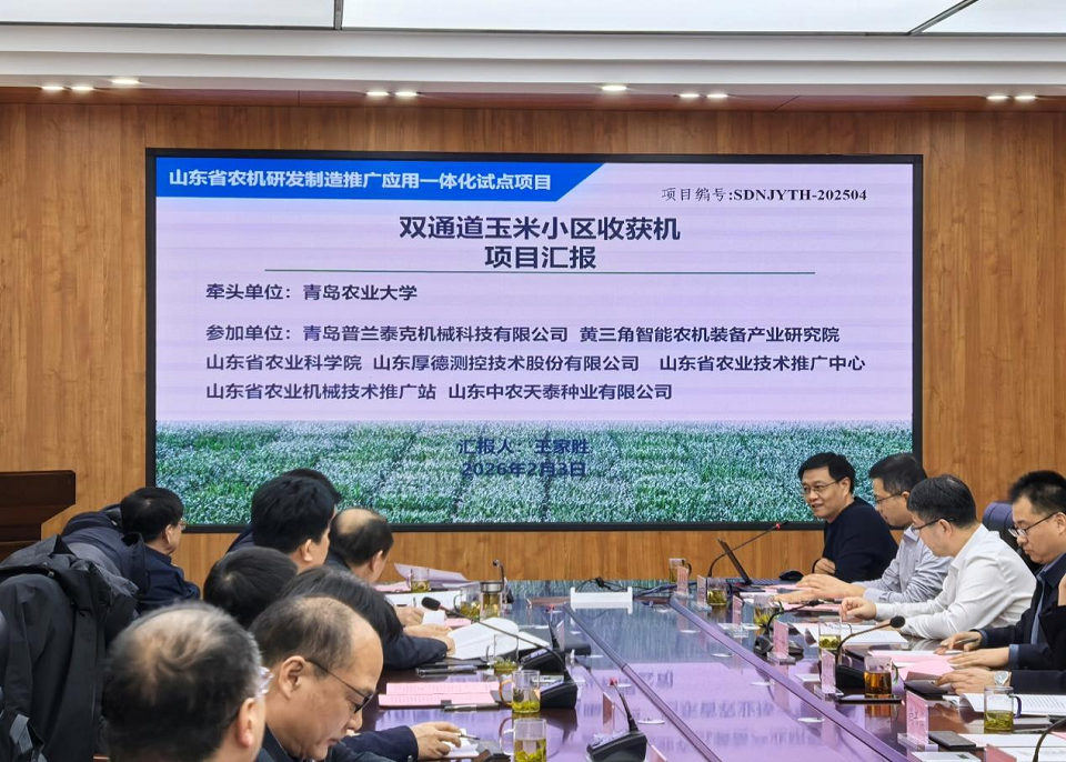 2026年2月3日,山东省农机研发制造推广应用一体化试点项目“双通道玉米小区收获机”启动会在太阳成集团tyc234cc会议室召开。该项目由太阳成集团tyc234cc牵头承担,青岛普兰泰克机械科技有限公司等四家单位协同参与。国内相关领域行业专家、山东省农业农村厅分管领导以及项目组成员出席本次会议。