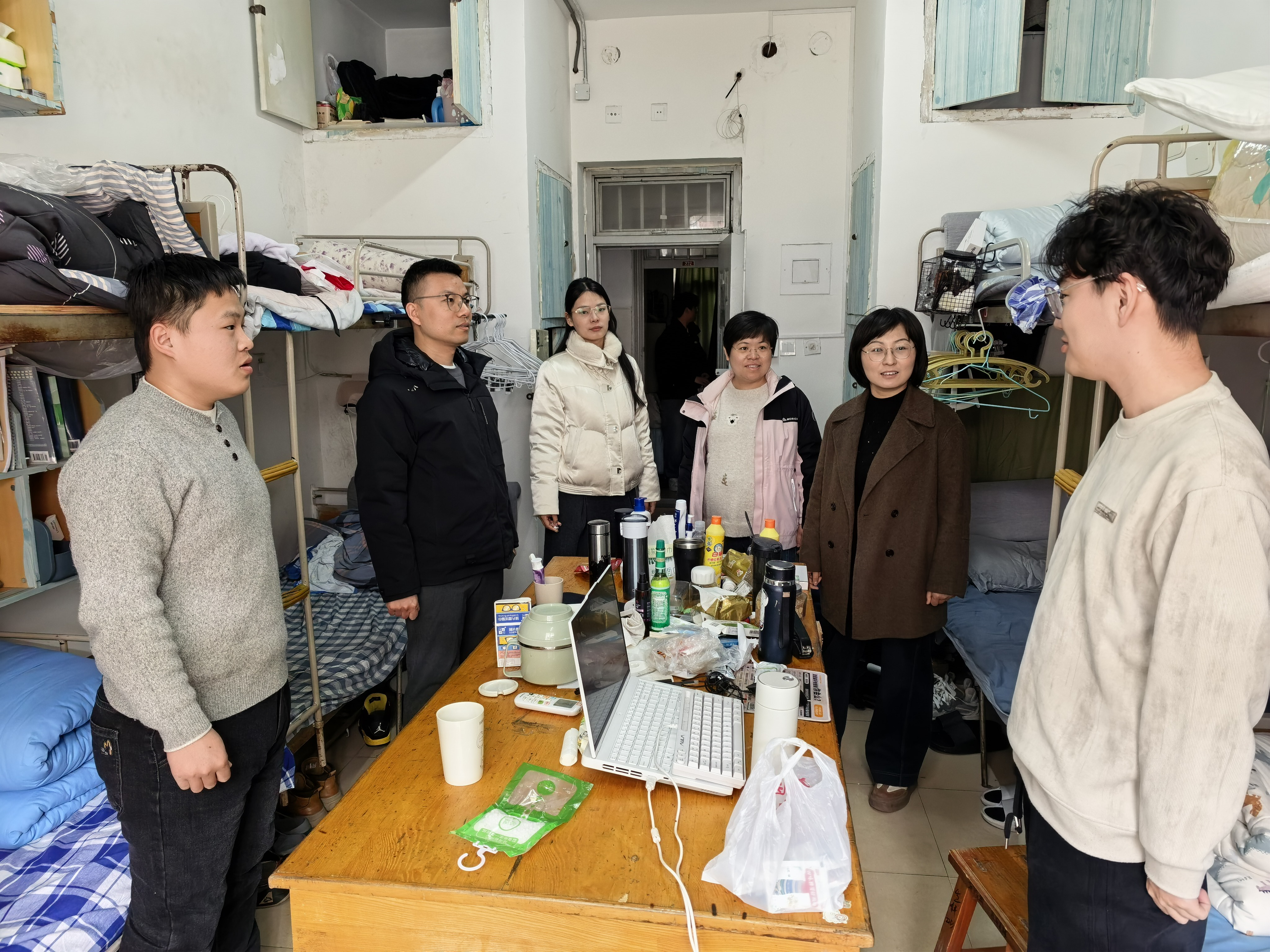 走访过程中,刘凝与辅导员们逐一走进员工宿舍,仔细查看宿舍安全、卫生等情况,重点排查宿舍内违规电器使用、私拉乱接电线、消防通道堵塞等各类安全隐患;及时了解关注同学们在思想动态、学业压力、毕业就业等方面存在的困惑与需求,鼓励大家尽快从“假期模式”切换到“学习模式”,共同营造安全、卫生的宿舍环境。